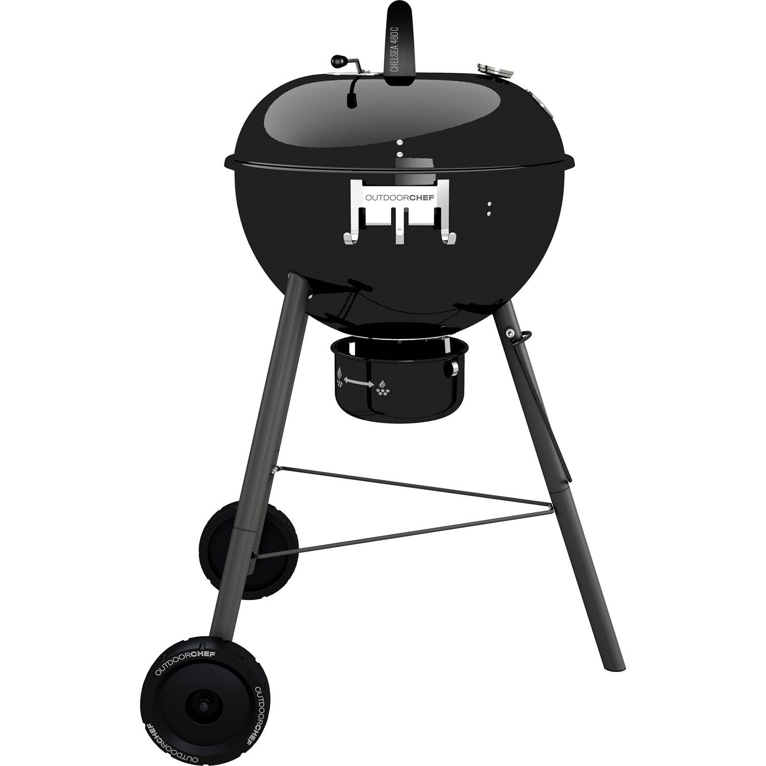 Den sammenklappelige kromgrillrist kan nemt og sikkert fyldes op med kul, uden at temperaturen falder. Trækulskurven i rustfrit stål muliggør hurtig optænding med minimalt tab af kul/briketter under grillning. Varmen styres ved hjælp af ventilationssystemet med håndtag for at sikre optimal regulering af varme og luft. Elkedlen og juicebakken er porcelænsemaljeret, hvilket gør det nemt at rengøre.