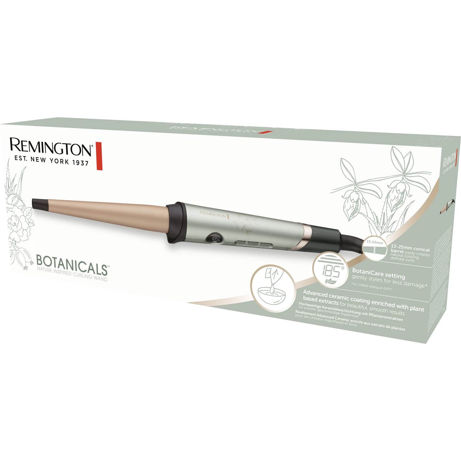Remington Botanicals 13-25 mm kegleformede krøllejern har en avanceret keramisk belagt cylinder med mikrobalsam beriget med urteingredienser fra Aloe Vera, Jojoba og Rose ekstrakt, hvilket giver dig smukke, sunde og naturlige krøller. Start fra hårets rod og afslut med spidserne. Med den fede spids og stylinghandsken fikser du din styling uden at skulle brænde dig unødigt!