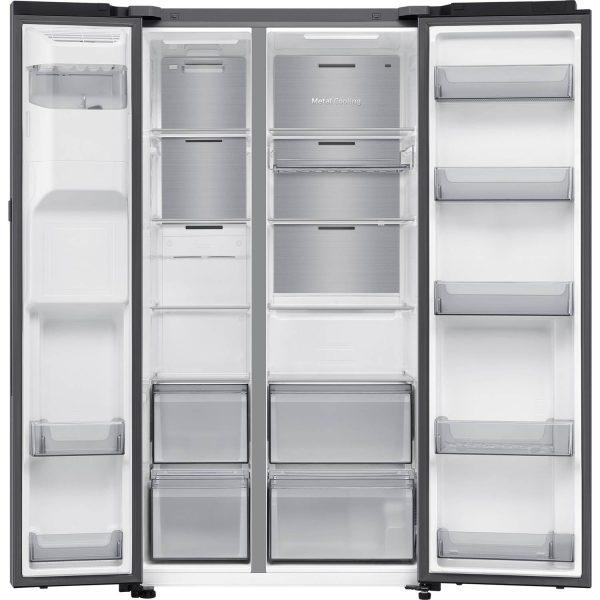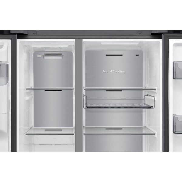 Side-by-side RS90F64EDTEF fra Samsung er et køle-fryseskab, der ikke kun tilbyder masser af plads, men også smart teknologi, der gør hverdagen lettere – perfekt til det moderne hjem.