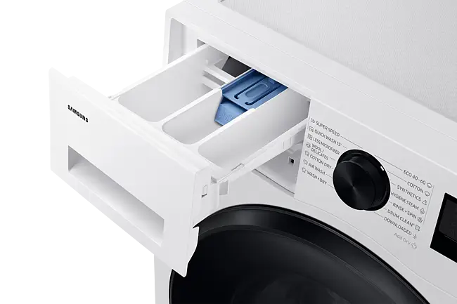 Indbygget Wi‑Fi og SmartThings-appen gør det nemt at starte, planlægge og overvåge vasken samt få forslag til optimale indstillinger. Eco 40–60 er dit daglige valg for et effektivt forbrug, og maskinen er klassificeret i energiklasse E som kombimaskine og A ved ren vask for en balanceret drift.